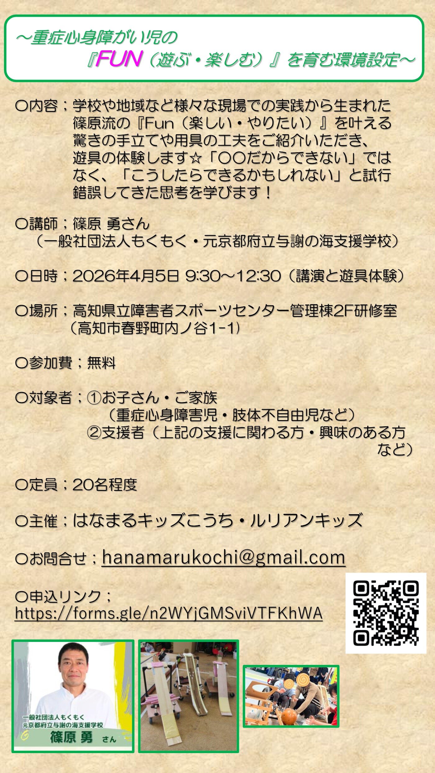 お知らせ 2026.03.31 【ご案内】~重症心身障がい児の「FUN(遊ぶ・楽しむ)」を育む環境設定~ ~重症心身障がい児の「FUN(遊ぶ・楽しむ)」を育む環境設定~ 主催:はなまるキッズこうち・ルリアンキッズ 日時:2026年4月5日(日)9:30~ 会場:高知県立障害者スポーツセンター 一覧へ
